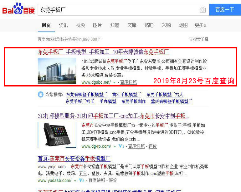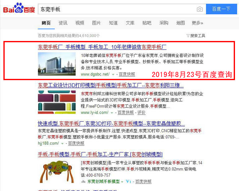 東莞手板廠 : 2019-02-28上線(xiàn) 2019-03-05百度第18名 2019-03-19百度第8名 2019-03-25百度第2名(排名第1名的網(wǎng)站www.dgsbc.net也是我公司管理優(yōu)化的網(wǎng)站)